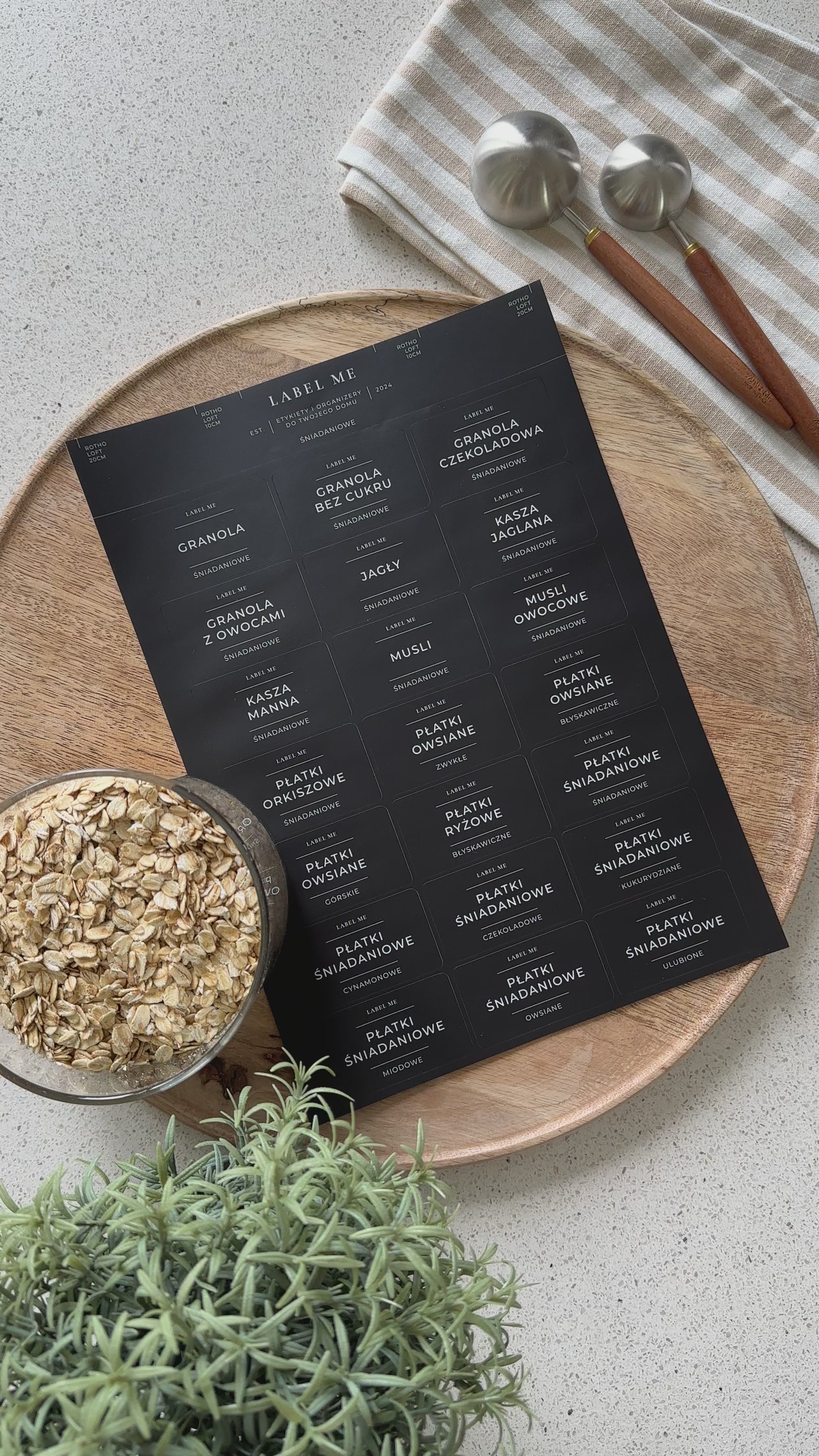 Uniwersalny zestaw 21 etykiet na pojemniki kuchenne, odpowiadający liście najczęściej spotykanych sypkich produktów śniadaniowych, takich jak musli, granole, płatki śniadaniowe, owsiane, kasza manna lub jaglana.*